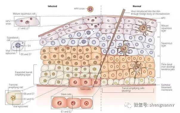 HPV在人和某些动物中广泛分布,有高度的特异性。感染常为局限性而非系统性。具有嗜上皮细胞性的特点。皮肤与粘膜较易感染。在基底层细胞中潜伏,而在鳞状上皮细胞中复制、转录和增殖。