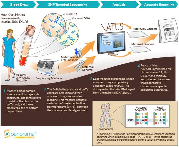 在懷孕期間,胎兒的部分 DNA 會進入準媽媽的血液中。這些DNA記錄了胎兒的遺傳資訊。Panorama™會通過準媽媽的血液樣本分析胎兒的 DNA,以尋找可能影響胎兒健康的染色體異常情況。